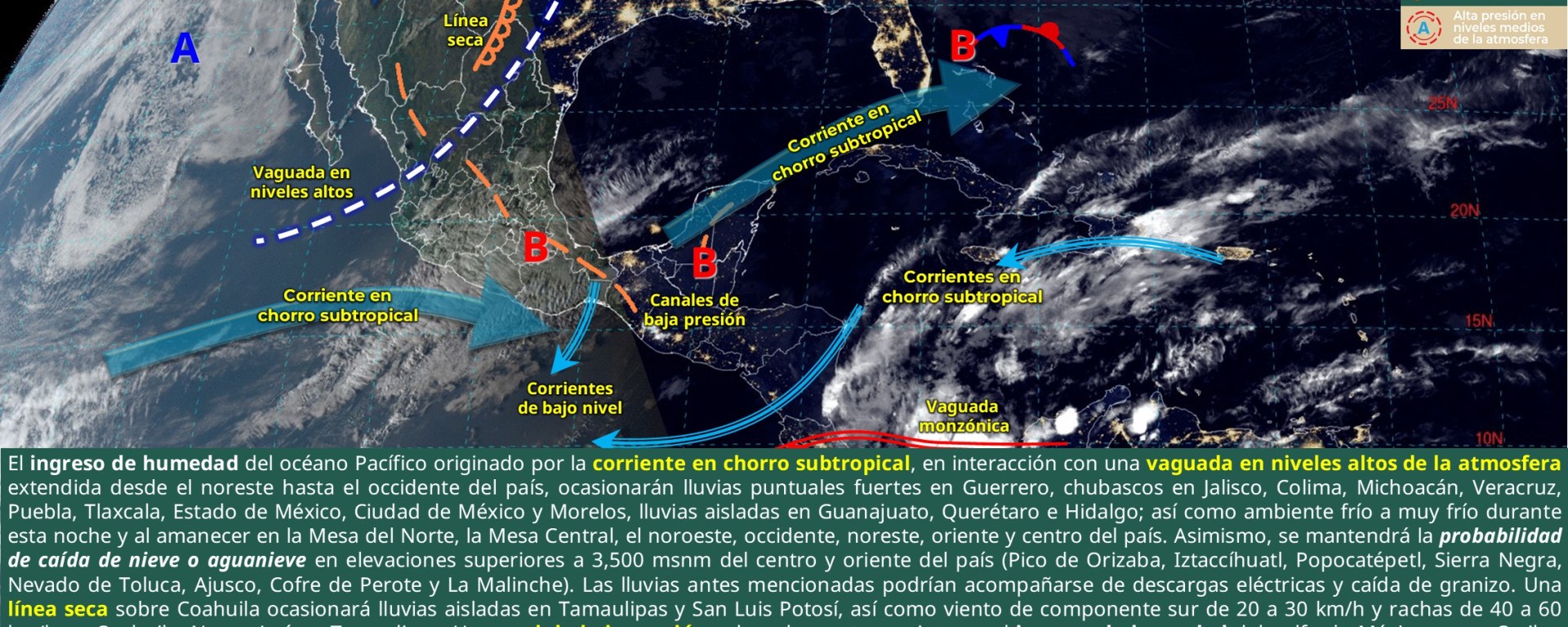 Posible caída de nieve o aguanieve: elevaciones superiores a 3,500 msnm del centro y oriente del país (Pico de Orizaba, Iztaccíhuatl, Popocatépetl, Sierra Negra, Nevado de Toluca, Ajusco, Cofre de Perote y La Malinche).