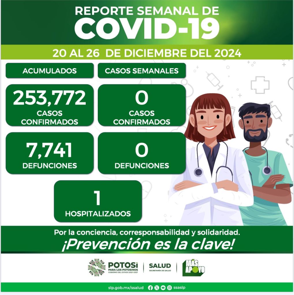 En San Luis Potosí son 253 mil 772 casos totales de COVID-19 los que se tienen registrados, y la cifra de muertes se mantiene en 7 mil 741 al no presentarse nuevas defunciones del virus, una personas se encuentra hospitalizada debido a esta enfermedad.