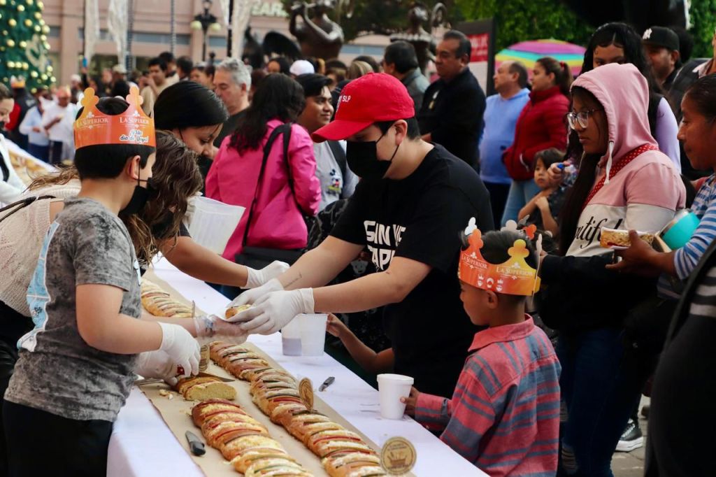 El Ayuntamiento de San Luis Potosí compartió con cientos de familias potosinas la monumental Rosca de Reyes de más de 200 metros de largo. La convivencia tuvo lugar en la Plaza de Armas, frente a Palacio Municipal, donde se distribuyeron 850 Niños Dios en este pan tradicional que trae alegría a niñas, niños, adultos y personas adultas mayores.