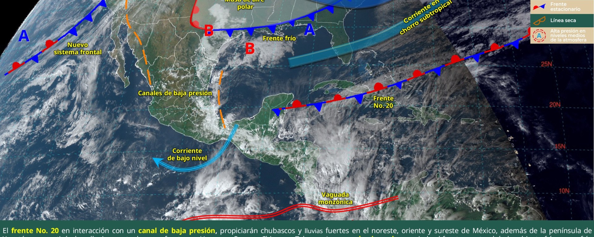 Lluvias aisladas (0.1 a 5 mm): Jalisco, Colima, Michoacán, Guerrero, Tamaulipas, San Luis Potosí, Querétaro, Hidalgo, Puebla, Tlaxcala, Estado de México y Ciudad de México.