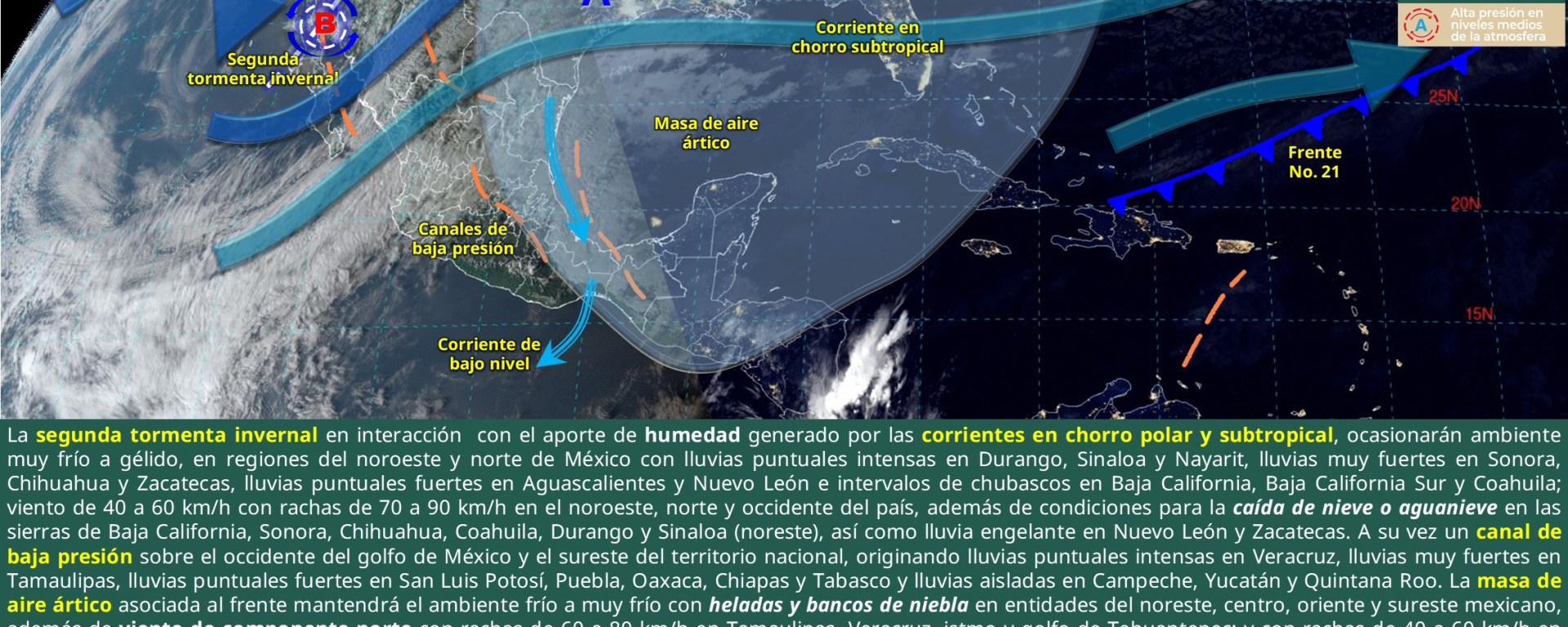 Cielo nublado con lluvias puntuales intensas en Durango, muy fuertes en Zacatecas, lluvias fuertes en Chihuahua, Coahuila, Nuevo León y Aguascalientes, las cuales podrían propiciar encharcamientos, inundaciones, deslaves y el crecimiento en los niveles de ríos y arroyos; y chubascos en San Luis Potosí. Durante la mañana se pronostica ambiente frío a muy frío, y gélido en sierras de Chihuahua y Durango. Por la tarde ambiente frío a fresco en la región. Viento de dirección variable de 50 a 60 km/h con rachas de 80 a 100 km/h en Chihuahua y Durango; de 40 a 50 km/h con rachas de 70 a 90 km/h en Coahuila, Nuevo León, San Luis Potosí, Zacatecas y Aguascalientes. Existen condiciones para la caída de nieve o aguanieve en zonas serranas de Chihuahua, Durango y Coahuila, y lluvia engelante en Nuevo León y Zacatecas.