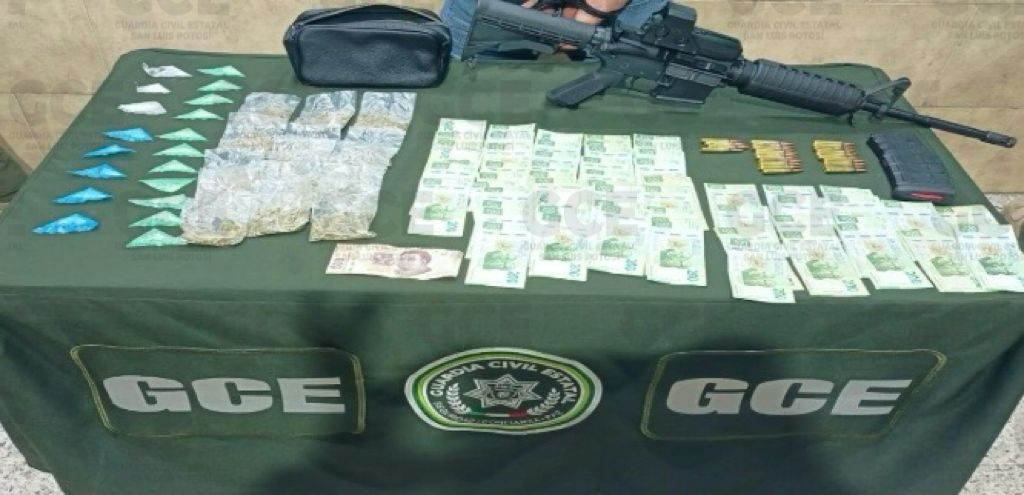Tras una revisión bajo previa autorización, se le encontraron 19 dosis de la droga conocida como “cristal”, 15 dosis de marihuana, la cantidad de 12 mil 300 pesos en moneda nacional así como un fusil calibre 5.56 mm. abastecido con 24 cartuchos útiles. Además quedó asegurado el vehículo en el que se desplazaba siendo un Nissan Sentra en color gris, modelo 2021.