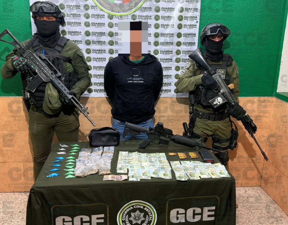 A través de las acciones operativas con enfoque de alto impacto a cargo de la Guardia Civil Estatal, un sujeto fue detenido en la colonia Valle Dorado en la capital potosina, por presunta posesión de droga, portación de arma de fuego y cohecho; se le considera uno de los principales líderes de su célula criminal y delincuencial que pretende sentar sus reales.