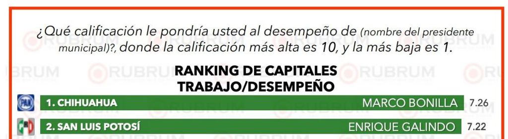 En la evaluación de la encuestadora Rubrum del primer mes del año, el Ayuntamiento de San Luis Potosí se colocó en segundo lugar entre las ciudades capitales del país en desempeño, servicios públicos y cercanía con la población.