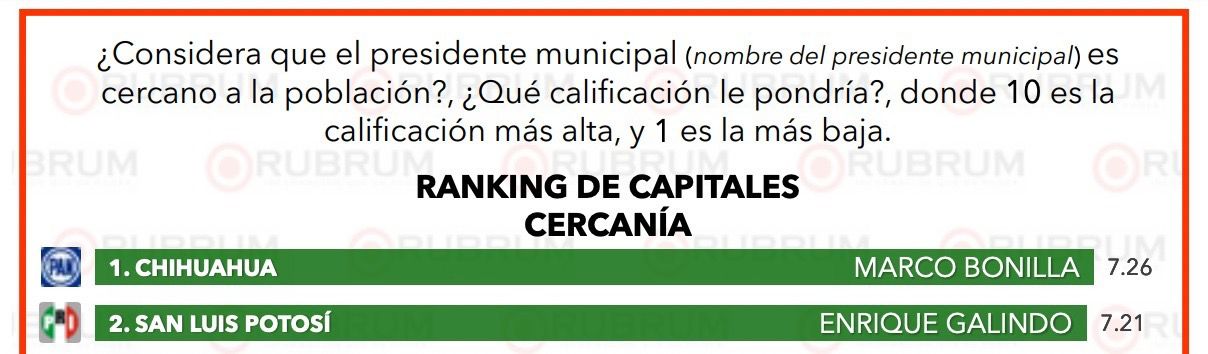 En las mediciones destaca que Galindo Ceballos se ubica en segundo lugar nacional en cuanto a trabajo / desempeño, con 7. 22 puntos, entre todas las ciudades capitales del país. En lo que respecta a Servicios Públicos, el Ayuntamiento de San Luis Potosí también subió al segundo lugar, con 6.63 puntos, sólo por debajo de Chihuahua.