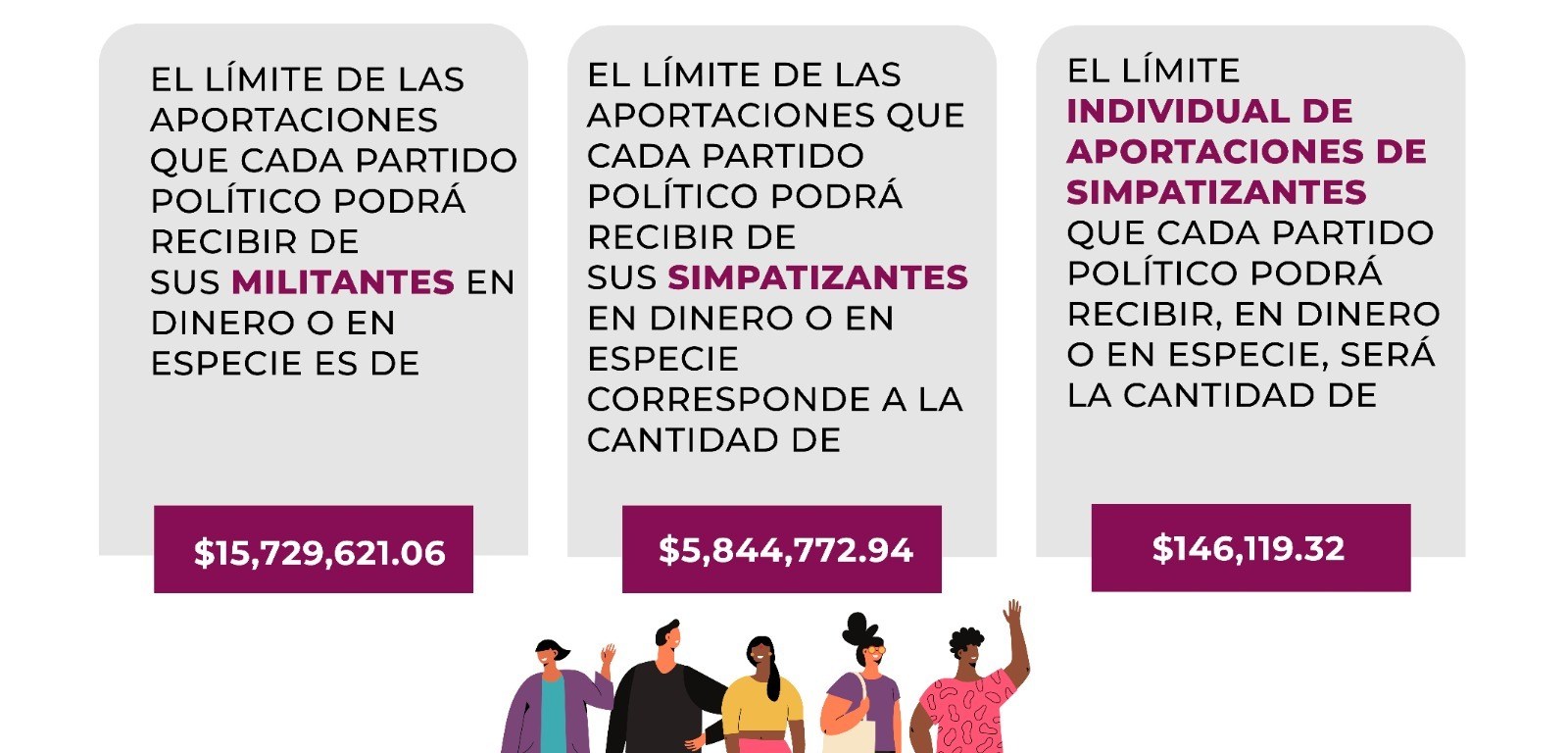 El límite de aportaciones que cada partido político podrá recibir en el año en dinero o especie a través de sus militantes, es la cantidad de $15,729,621 pesos (Quince millones setecientos veintinueve mil seiscientos veintiún pesos); en cuanto el límite individual de aportaciones de simpatizantes en dinero y especie es de $5,844,772 pesos (Cinco millones ochocientos cuarenta y cuatro mil setecientos setenta y dos pesos); por último el límite individual de aportaciones de simpatizantes que cada partido político podrá recibir, en dinero o en especie, será la cantidad de $146,119 pesos (ciento cuarenta y seis mil ciento diecinueve pesos).