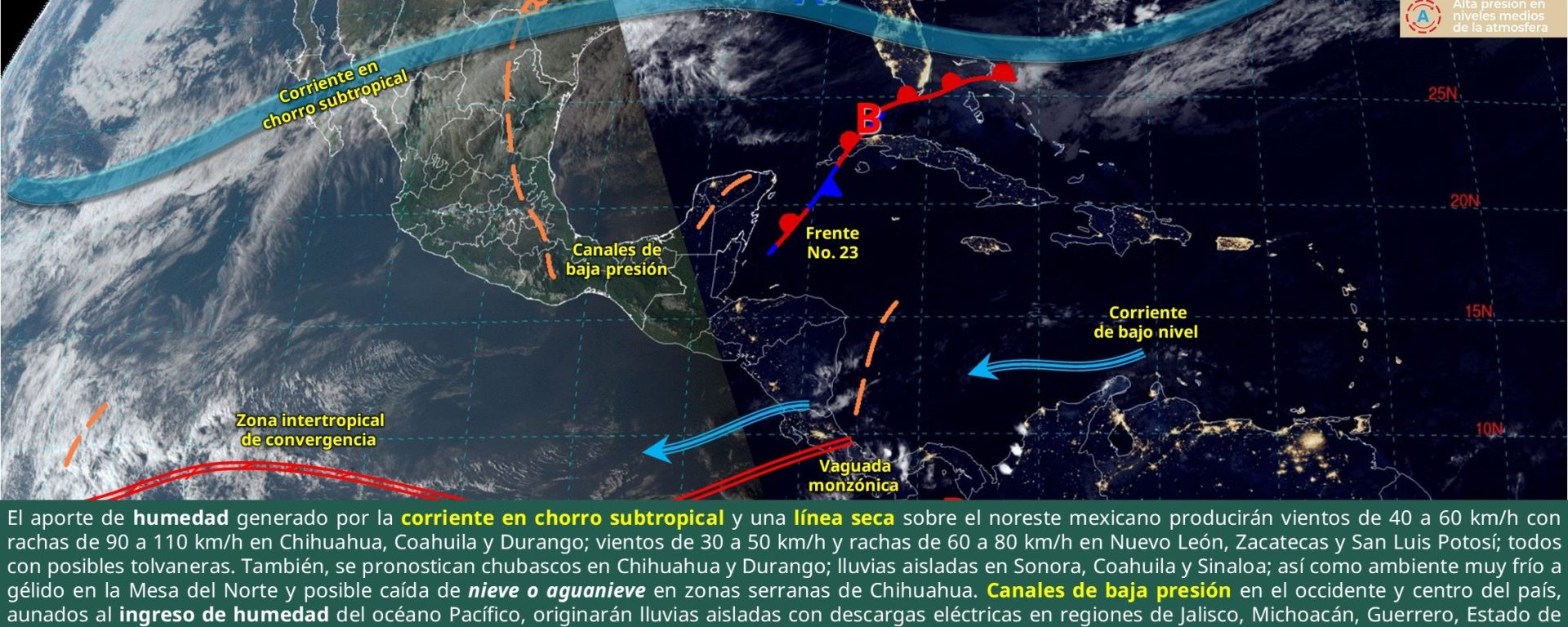 Cielo medio nublado a nublado con lluvias aisladas en San Luis Potosí y sin lluvia en el resto de la región. Durante la mañana, ambiente muy frío; gélido con heladas en sierras de Chihuahua y Durango. Por la tarde-noche descenso de la temperatura en la región. Viento del oeste y noroeste de 30 a 50 km/h con rachas de 70 a 90 km/h y posibles tolvaneras en Chihuahua y Durango; de 20 a 40 km/h con rachas de 50 a 70 km/h en Coahuila, Nuevo León, Tamaulipas, Zacatecas y San Luis Potosí; y de 20 a 30 km/h con rachas de 40 a 60 km/h en Aguascalientes.