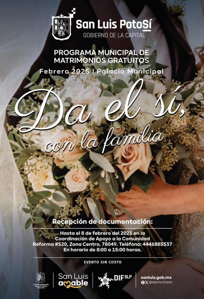 El Sistema Municipal DIF de San Luis Potosí invita a todas las parejas interesadas a participar en el programa “Da el Sí con la Familia” este próximo 14 de febrero.