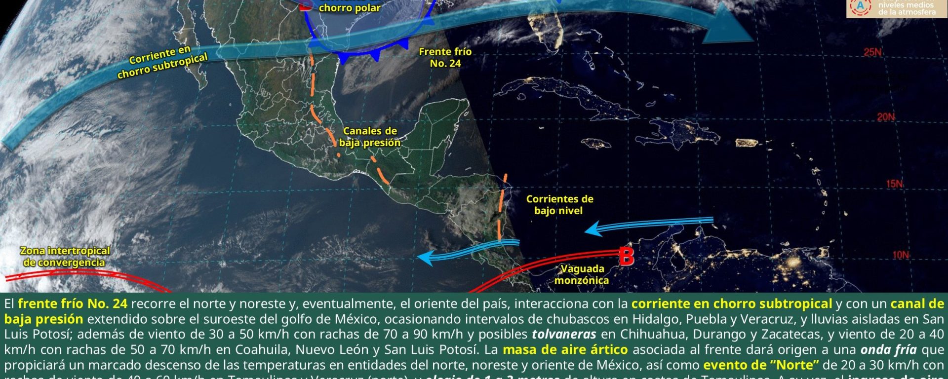 Evento de “Norte” de 40 a 60 km/h con rachas de 70 a 90 km/h: Tamaulipas, Veracruz e istmo y golfo de Tehuantepec, y de 20 a 40 km/h con rachas de 50 a 70 km/h: Tabasco, Campeche y Yucatán.