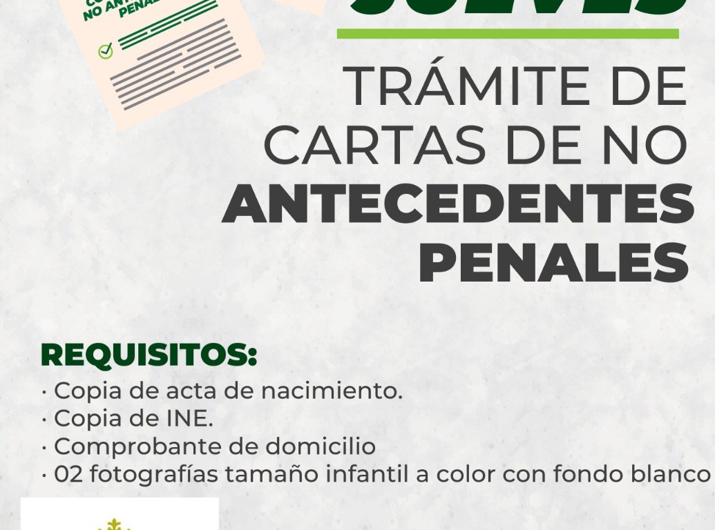 Los requisitos para la expedición de las cartas de antecedentes no penales son: copia de acta de nacimiento, copia de identificación oficial (INE), comprobante de domicilio y dos fotografías tamaño infantil a color con fondo blanco.