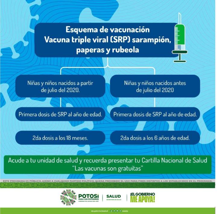 Atendiendo a la instrucción del Gobernador, Lic. Ricardo Gallardo Cardona, de trabajar por la salud de la niñez potosina, se cuenta con abasto de la vacuna contra el sarampión en el Estado, la cual se aplica para niñas y niños nacidos a partir de julio del 2020 al primer año de edad y un refuerzo a los 18 meses. Niñas y niños nacidos antes de julio de 2020 la primera dosis se aplicó al primer año de edad y su segunda dosis es a los 6 años.