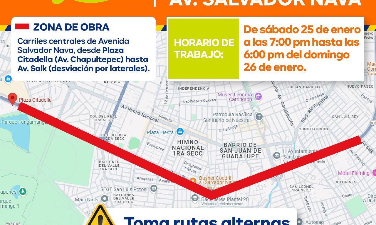 Con el objetivo de agilizar los avances en la rehabilitación integral de la avenida Salvador Nava Martínez, el Gobierno Municipal de San Luis Potosí, a través de la Dirección de Obras Públicas, mediante el programa Vialidades Potosinas, realizará este fin de semana una jornada intensiva de trabajo, en horario nocturno y diurno. Los trabajos comenzarán el sábado a partir de las 7:00 pm y se extenderán hasta el domingo a las 6:00 pm.