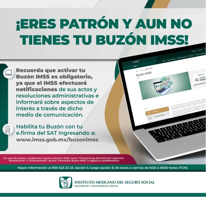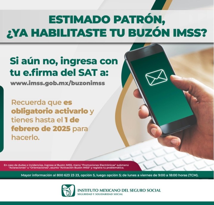 Como parte de la modernización de los servicios y con el objetivo de simplificar y agilizar los trámites que llevan a cabo las personas registradas como patrones, el Instituto Mexicano del Seguro Social (IMSS) cuenta con la herramienta digital denominada Buzón IMSS, la cual deberá ser habilitada por las y los patrones con fecha límite el 1 de febrero.