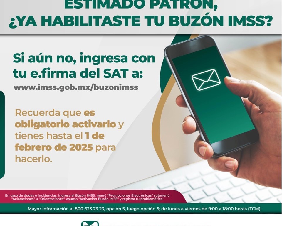Como parte de la modernización de los servicios y con el objetivo de simplificar y agilizar los trámites que llevan a cabo las personas registradas como patrones, el Instituto Mexicano del Seguro Social (IMSS) cuenta con la herramienta digital denominada Buzón IMSS, la cual deberá ser habilitada por las y los patrones con fecha límite el 1 de febrero.