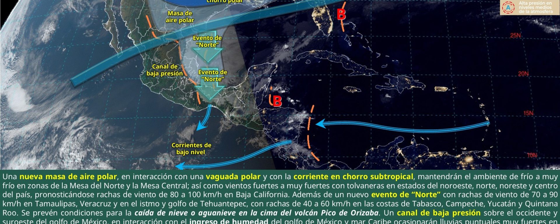 Evento de “Norte” de 50 a 60 km/h con rachas de 90 a 110 km/h, disminuyendo por la noche: Veracruz e istmo y golfo de Tehuantepec; de 30 a 40 km/h con rachas de 50 a 70 km/h: Tamaulipas y Quintana Roo; y de 20 a 30 km/h con rachas de 40 a 60 km/h: Tabasco, Campeche y Yucatán.