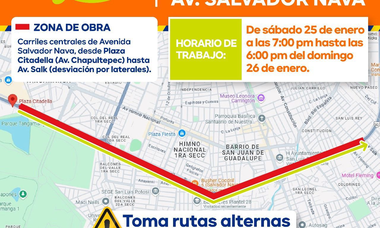 Este sábado 25 de enero, el Ayuntamiento de San Luis Potosí arranca una jornada intensiva de rehabilitación en la avenida Salvador Nava Martínez, con trabajos que arrancarán a las 19 horas y se prolongarán hasta mañana domingo a las 18 horas, en turnos diurnos y nocturnos.
