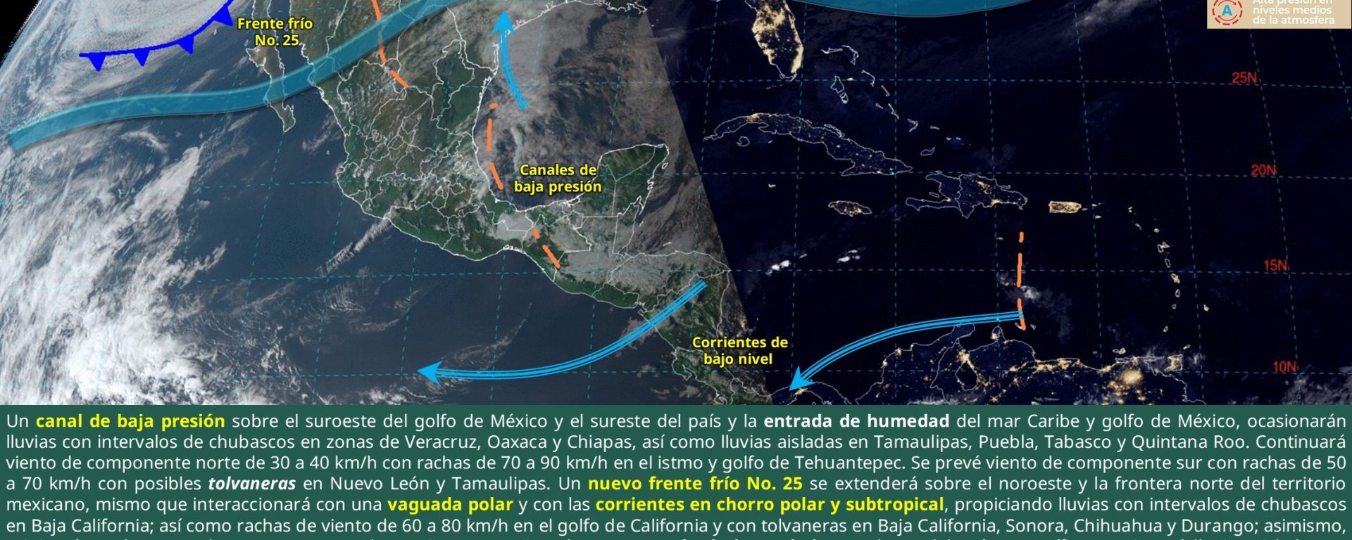 Viento de 20 a 30 km/h con rachas de 50 a 70 km/h: golfo de California; y con tolvaneras: Baja California, Sonora, Chihuahua y Durango.