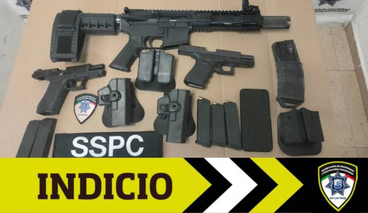 Al realizar la inspección dentro de la camioneta se encontraron: un rifle de asalto en color negro, dos pistolas calibre 9×19, cuatro cargadores (uno de ellos con 18 cartuchos útiles calibre .223), dos fundas de pistola, dos fundas para cargadores y un teléfono celular.