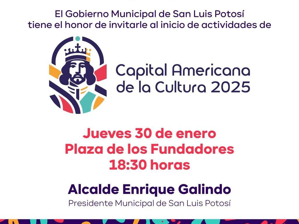 El Gobierno Municipal de San Luis Potosí invita al acto inaugural de las actividades de San Luis Potosí como Capital Americana de la Cultura 2025. Este significativo evento se llevará a cabo este jueves 30 de enero de 2025, en una celebración sobre tener a la ciudad el centro cultural del continente.