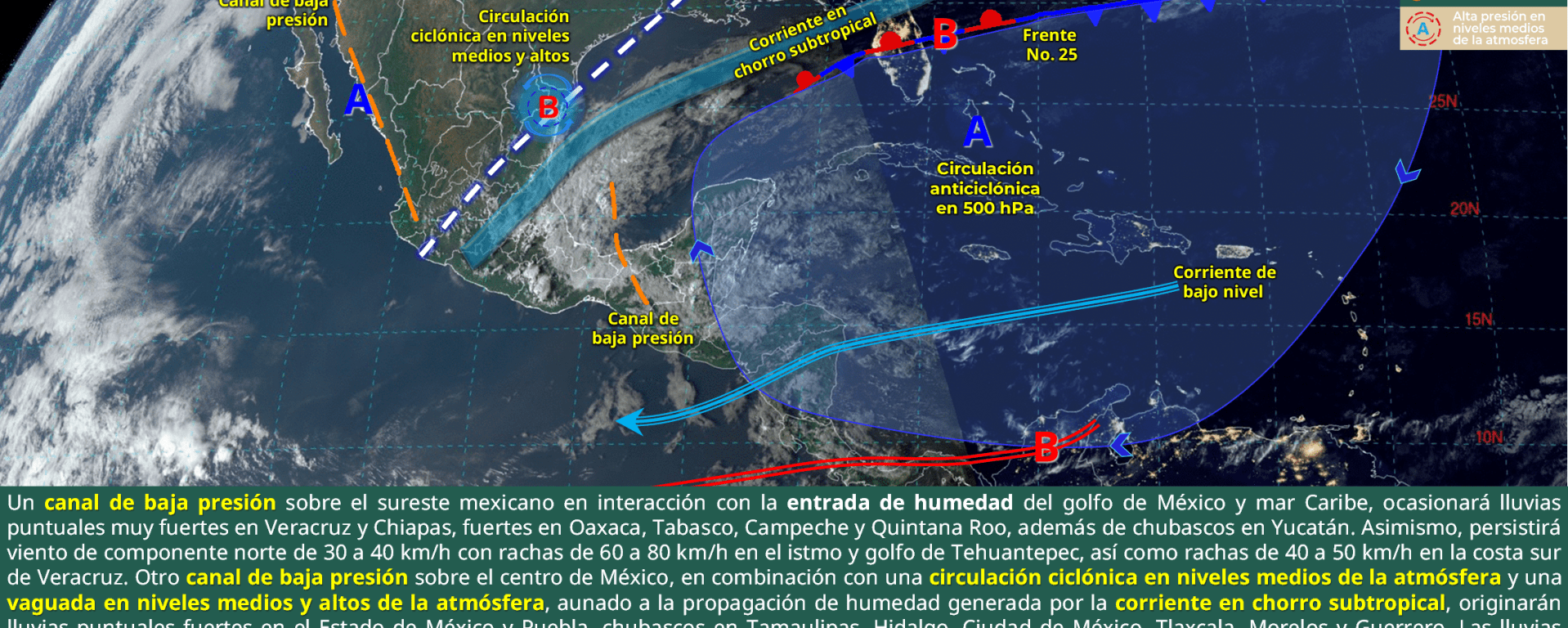 Intervalos de chubascos con lluvias puntuales fuertes (25 a 50 mm): Veracruz, Oaxaca, Chiapas y Tabasco.