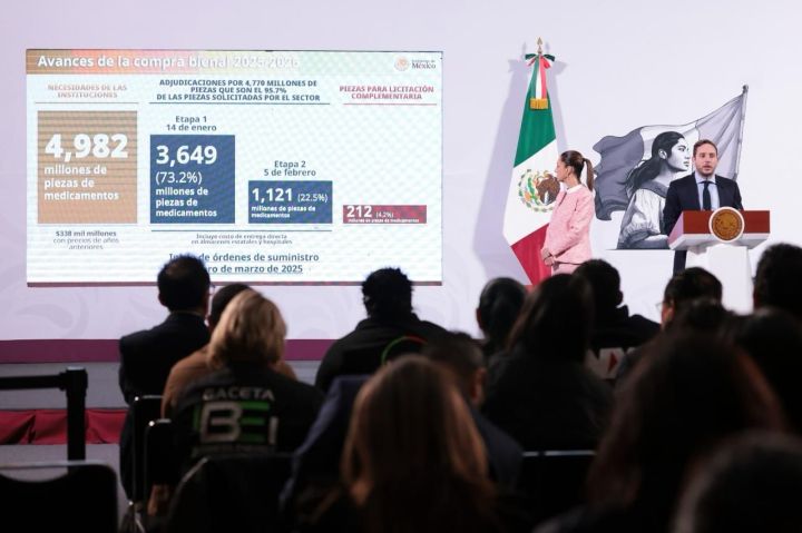 La Presidenta de México destacó que como parte de la Compra Consolidada de Medicamentos e Insumos Médicos 2025-2026 ya se tienen adjudicadas de manera exitosa el 95.7 por ciento de las 4 mil 982 millones de piezas que se requieren, por lo que en marzo comienza el abasto en hospitales y clínicas.