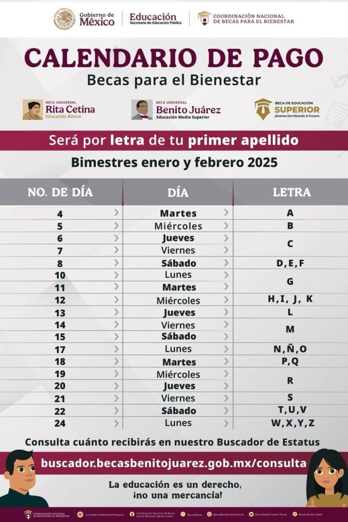 El delegado Memo Morales en compañía del coordinador estatal de becas, Osmar Rodríguez, expuso que de acuerdo con el calendario de pago, del 4 a 24 de febrero conforme a la primera letra del primer apellido los becarios recibirán un monto económico bimestral de $1,900 pesos en el caso de la Beca Benito Juárez y $5,800 pesos en el caso de la beca Jóvenes Escribiendo el Futuro.