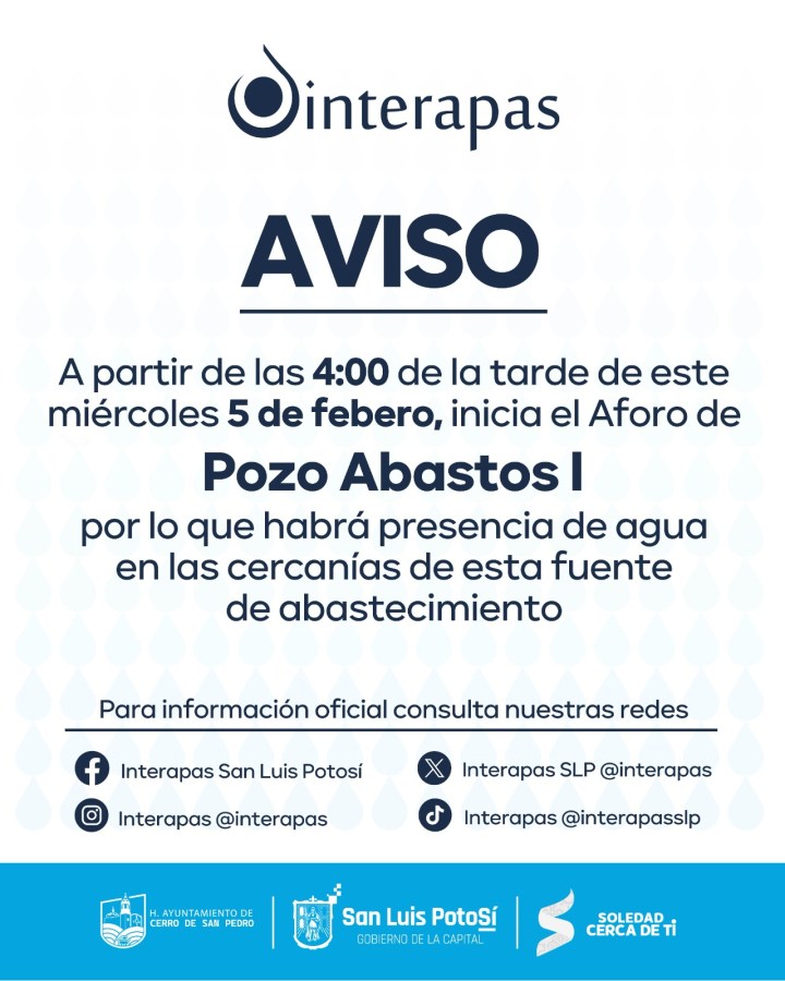 Para información oficial sobre este proceso se invita a la población a consultar las redes sociales oficiales del organismo a través de las diferentes plataformas bajo el nombre de Interapas San Luis Potosí.