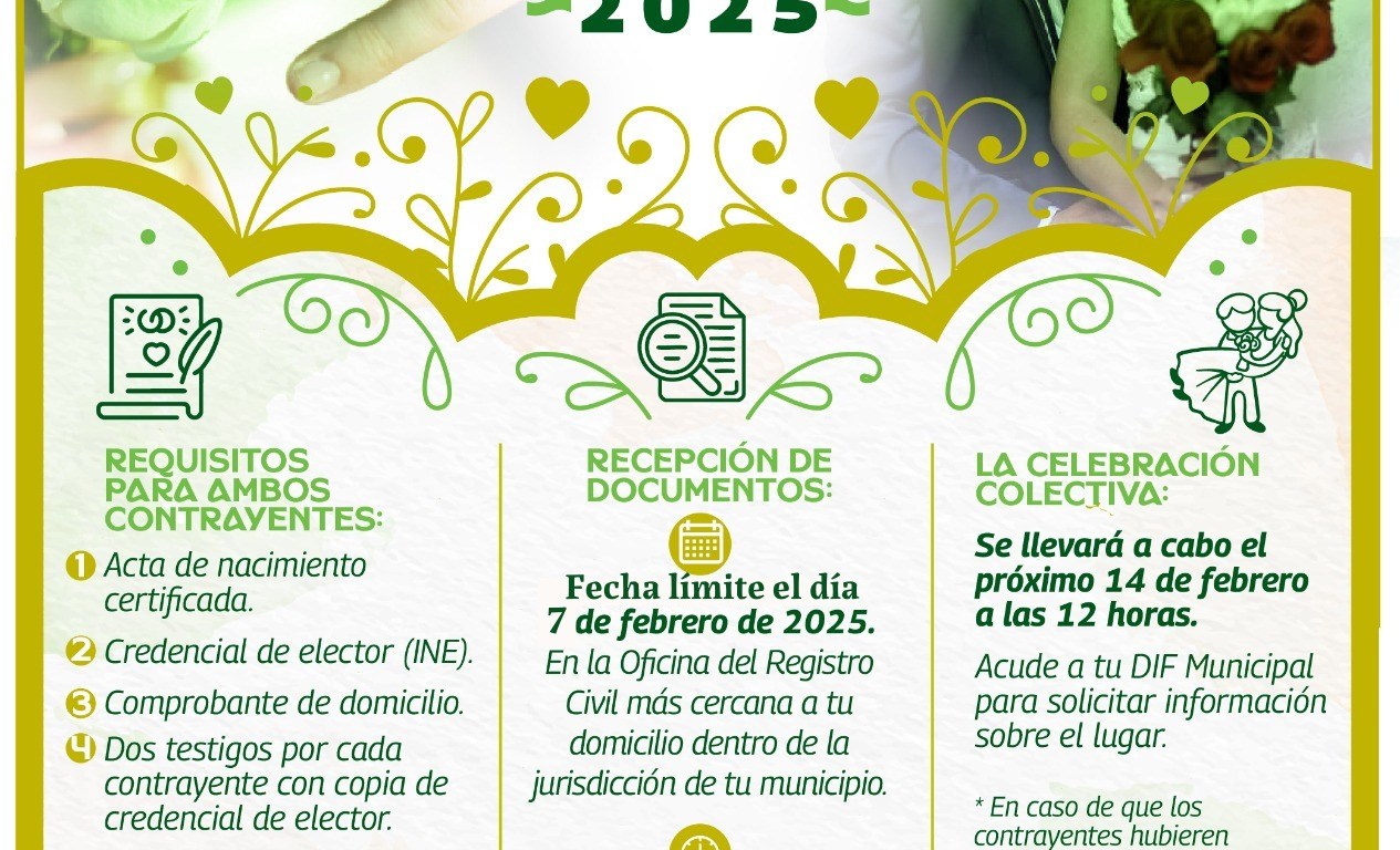 Este evento busca ofrecer un proceso gratuito, legal y accesible para todas las parejas que deseen formalizar su unión, garantizando un acto legal respaldado por el Concejo Municipal, los requisitos a presentar son: acta de nacimiento certificada, credencial de elector (INE), comprobante de domicilio, dos testigos por cada contrayente con copia de su credencial de elector, certificado médico y resultados de análisis prenupciales.