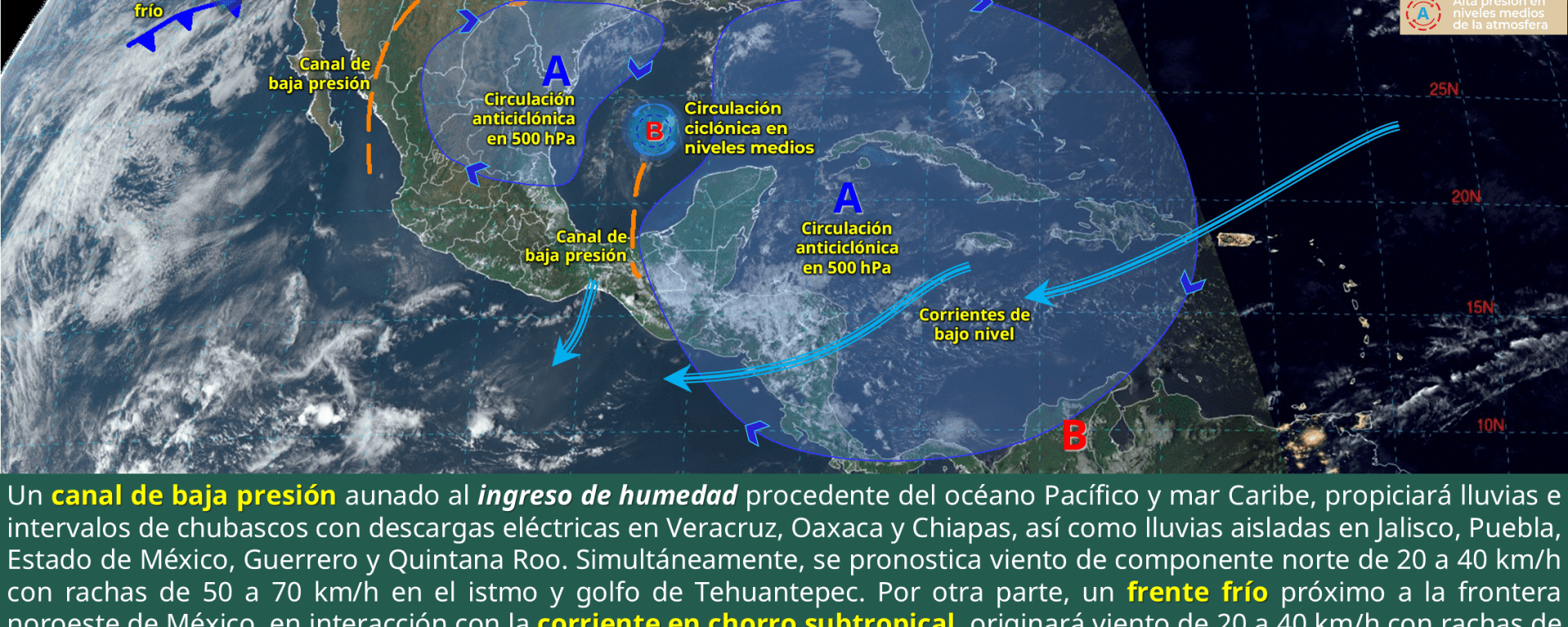 Viento de 15 a 25 km/h con rachas de 40 a 60 km/h: Baja California, Baja California Sur, Sonora, Chihuahua, Durango, Tabasco, Campeche y Yucatán.