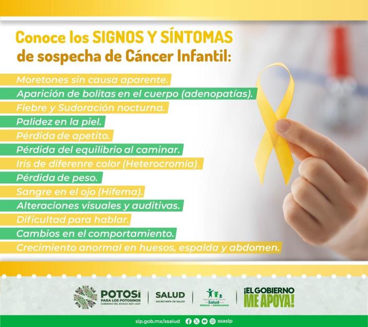 Los principales signos y síntomas que pueden identificar, incluyen: Fiebre (38 °C, de más de 7 días, no cede posterior a revisión médica); dolor de cabeza nocturno, que va en aumento y es constante; dolor de huesos o articulaciones en huesos largos y piernas, constante, no se mejora al descansar, que se acompaña de hinchazón, masas o limite el movimiento); sangrado de nariz, encías o moretones sin causas aparente; ausencia de reflejo rojo (tener la pupila blanca) y/o presentar masas o bolitas en cuello, clavícula, axila, espalda, abdomen, ingle o rodilla.