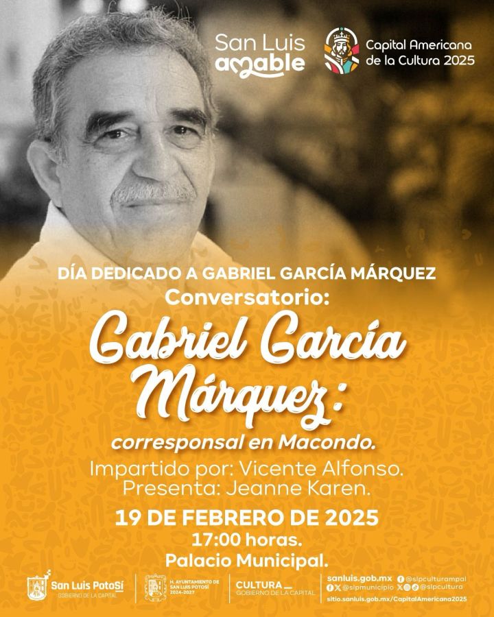 Dentro del programa cultural San Luis Potosí Capital Americana de la Cultura recibe arte y cultura de Colombia y Venezuela, este miércoles 19 de febrero se prevén tres actividades relacionadas con el gran escritor latinoamericano Gabriel García Márquez.