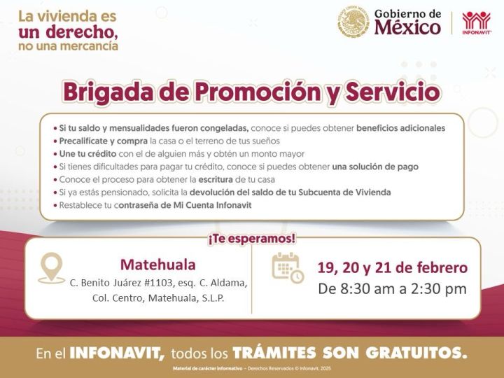 El Instituto del Fondo Nacional de la Vivienda para los Trabajadores (INFONAVIT) realizará sus Brigadas de Promoción y Servicio en el municipio de Matehuala, con el objetivo de acercar sus diferentes productos de financiamiento a las y los derechohabientes.