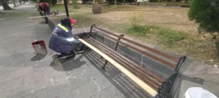 La Dirección de Servicios Municipales realizó intervenciones nocturnas en el jardín principal del tradicional Barrio de Santiago.