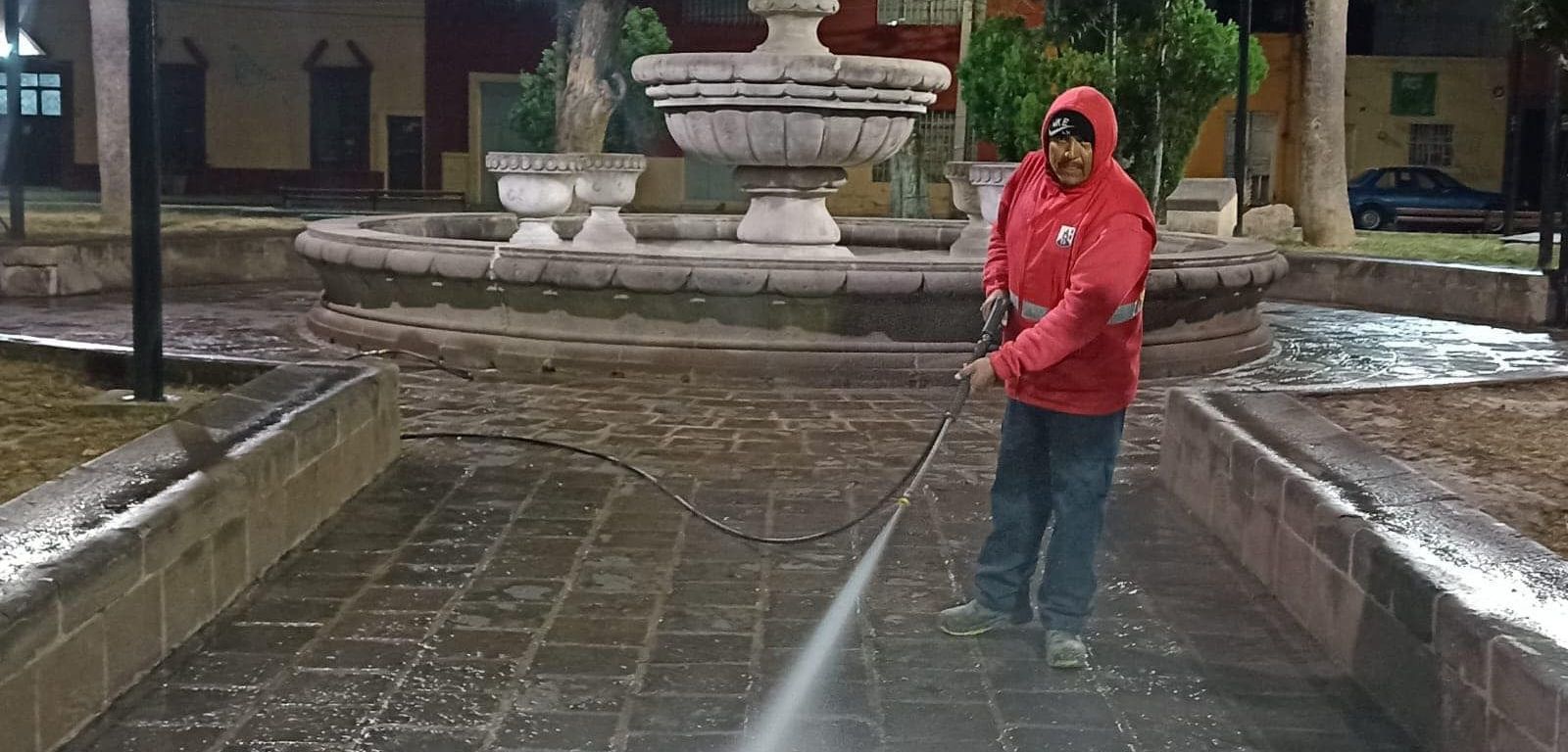 Entre las intervenciones sobresalen las que llevó a cabo personal de Imagen Urbana en el jardín principal del tradicional Barrio de Santiago, con tareas de hidrolavado y limpieza general donde se atendieron diversas áreas de esta zona para que la población disfrute de un entorno limpio y agradable.