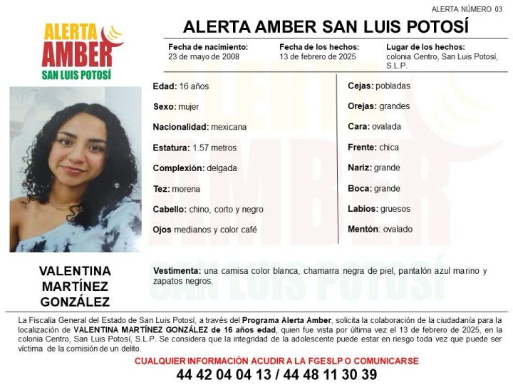 La Fiscalía General del Estado de San Luis Potosí (FGESLP) activó una Alerta Amber para la pronta localización de Valentina Martínez González, con quien se tuvo contacto por última vez el 13 de febrero de 2025, en la capital potosina.