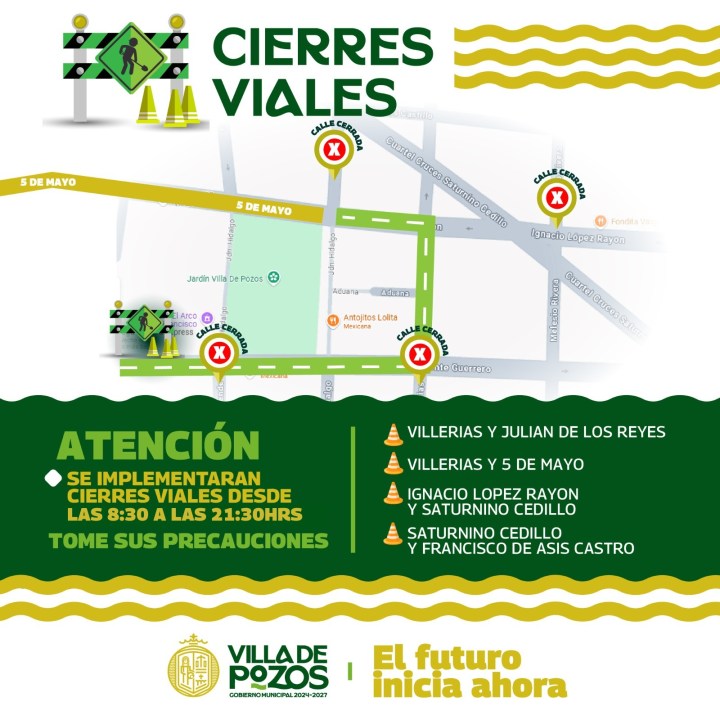 La dirección de Seguridad Pública municipal informa que se llevarán a cabo cierres viales en diferentes puntos estratégicos de la zona en un horario de 08:30 a 21:30 horas en las intersecciones de las calles Villerías y Julián de los Reyes, Villerías y 5 de mayo, Ignacio López Rayón y Saturnino Cedillo, y Saturnino Cedillo y Francisco de Asís Castro.