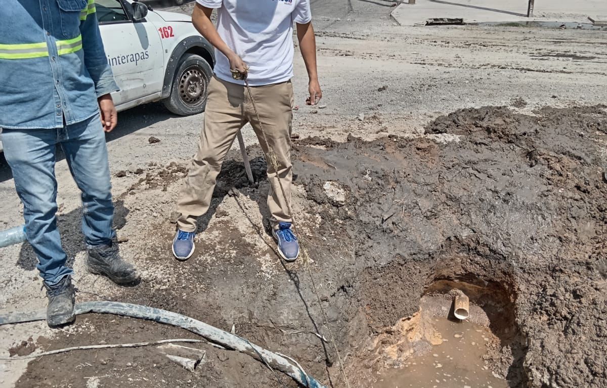 Gracias a reportes de usuarios, Interapas localizó y reparó una fuga de agua potable en la red de 3 pulgadas del Eje 122 esquina Centenario, en la Zona Industrial.