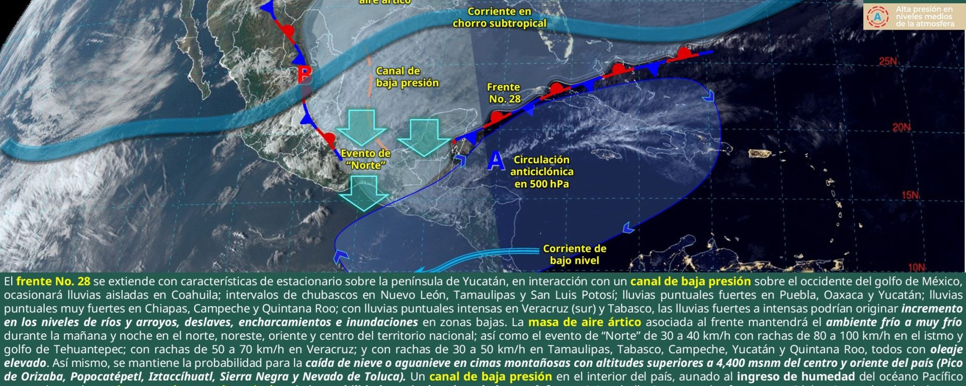 Viento de componente norte de 30 a 40 km/h con rachas de 60 a 80 km/h: istmo y golfo de Tehuantepec; de 20 a 30 km/h con rachas de 40 a 60 km/h: Tamaulipas y Veracruz.