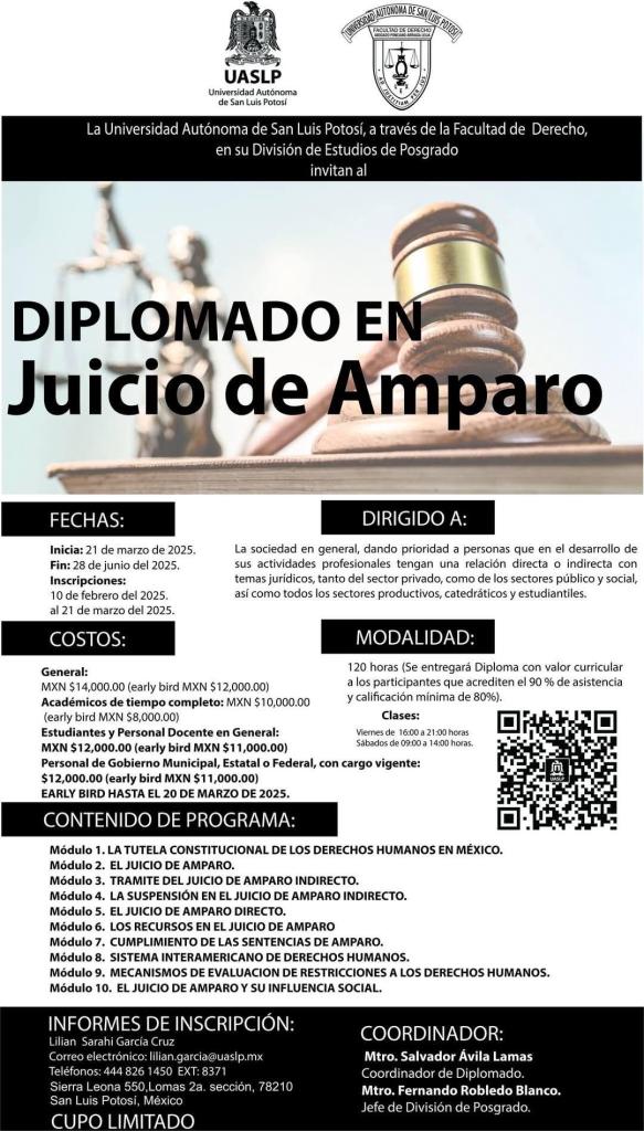 Con el objetivo de actualizar a los profesionales del área jurídica, la Facultad de Derecho «Abogado Ponciano Arriaga Leija» de la Universidad Autónoma de San Luis Potosí invita al Diplomado en Juicio de Amparo, del cual ofreció detalles el coordinador del programa, maestro Salvador Ávila Lamas.