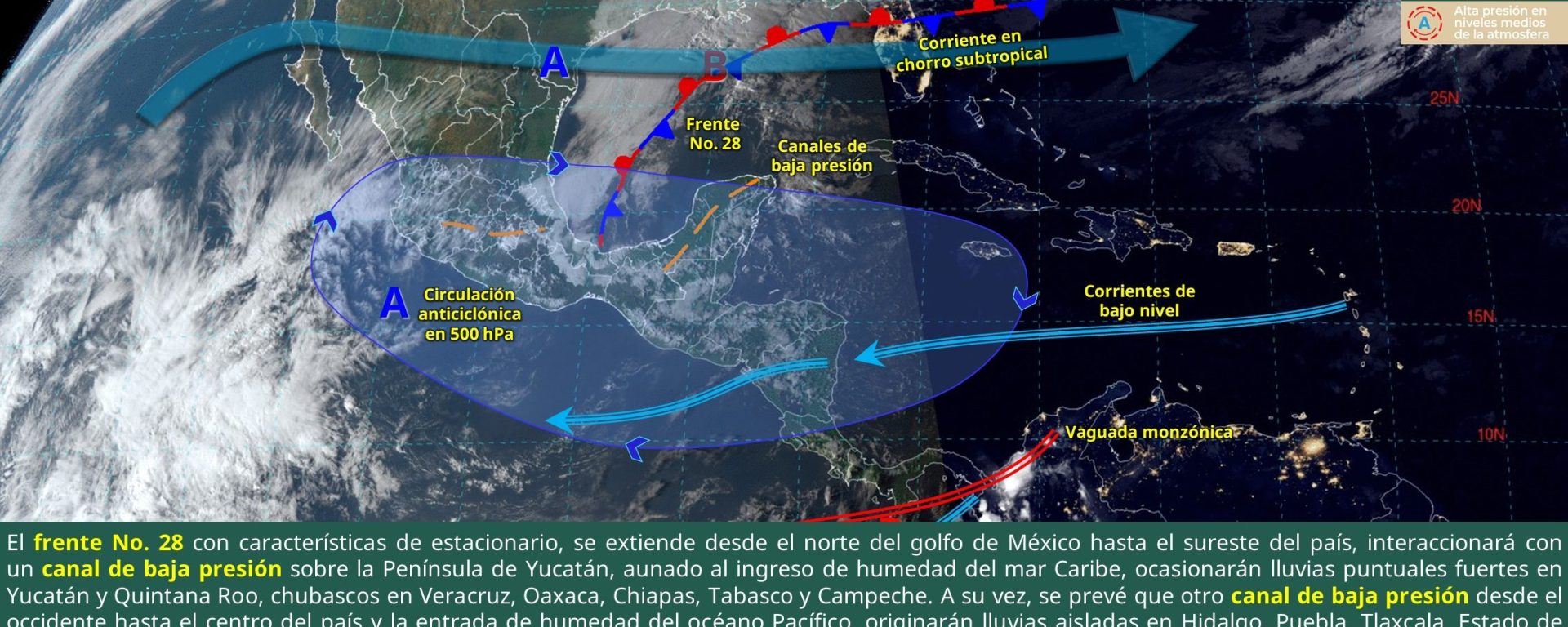 Intervalos de chubascos con lluvias puntuales fuertes (25 a 50 mm): Oaxaca, Chiapas, Tabasco y Quintana Roo.