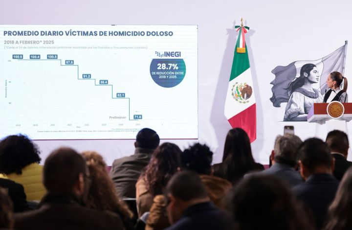 Ciudad de México a 25 de febrero de 2025.- La Presidenta de México, Claudia Sheinbaum Pardo, destacó que de acuerdo con datos preliminares, del 2018 al 24 de febrero de 2025, se ha logrado una reducción del 28.7 por ciento en el promedio diario de víctimas de homicidio doloso en el país, además de que, gracias a la Estrategia Nacional de Seguridad, al cierre de 2024 e inicios del 2025 se han registrado 10 homicidios diarios menos.