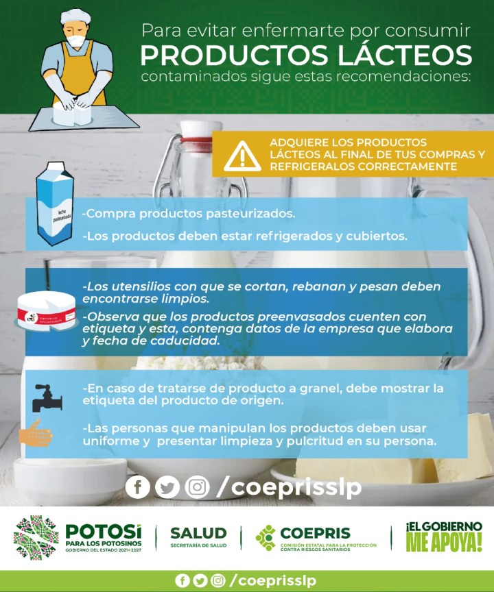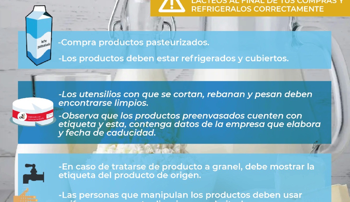 La COEPRIS recomienda a la población consumir leche, queso, crema u otros derivados de lácteos que se encuentren pasteurizados o ultrapasteurizados, que contengan etiqueta con fecha de caducidad, refrigerados y empacados; en caso de adquirir producto a granel se deberá observar la limpieza, refrigeración y que el cuchillo y tabla con que se despachan se encuentren limpios.