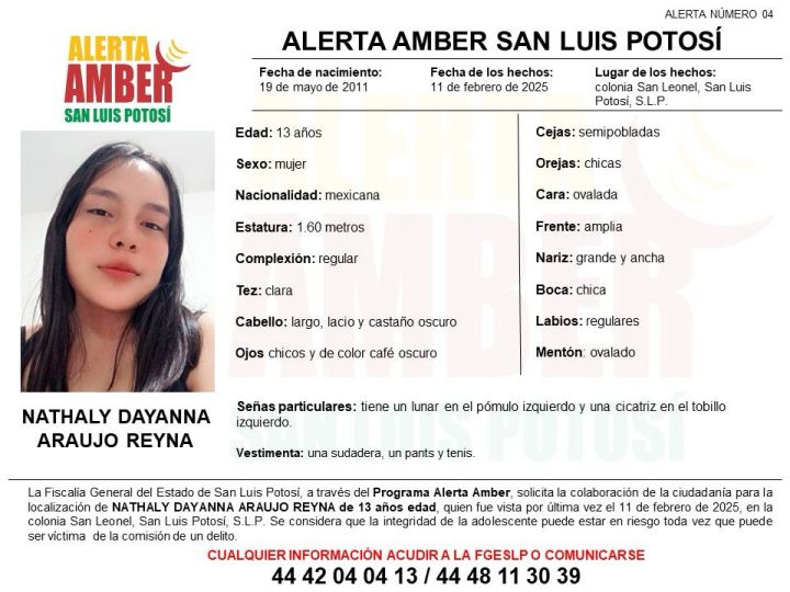 Fue activada una Alerta Amber para la localización de Nathaly Dayanna Araujo Reyna, quien tuvo contacto con sus familiares por última vez el 11 de febrero de 2025, en la colonia San Leonel de la ciudad Capital, indicó la Fiscalía General del Estado de San Luis Potosí (FGESLP).