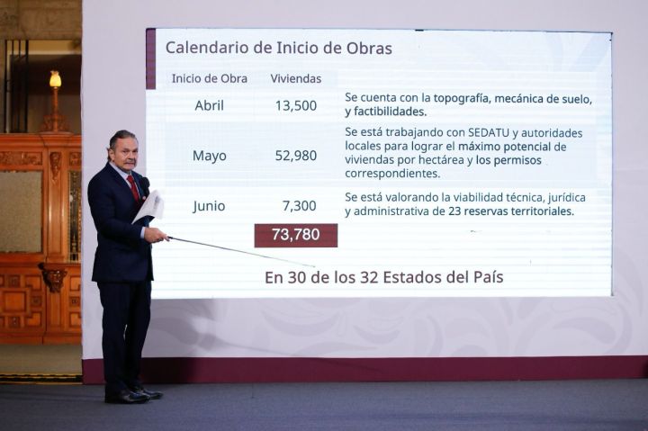 El director general del Infonavit, Octavio Romero Oropeza, destacó que para personas derechohabientes se construirán 73 mil 780 viviendas, en 29 estados; en 133 predios y en 424 hectáreas. Con ello la construcción comenzará en abril con 13 mil 500 viviendas, en mayo cerca de 53 mil y en junio con 7 mil 300 viviendas.