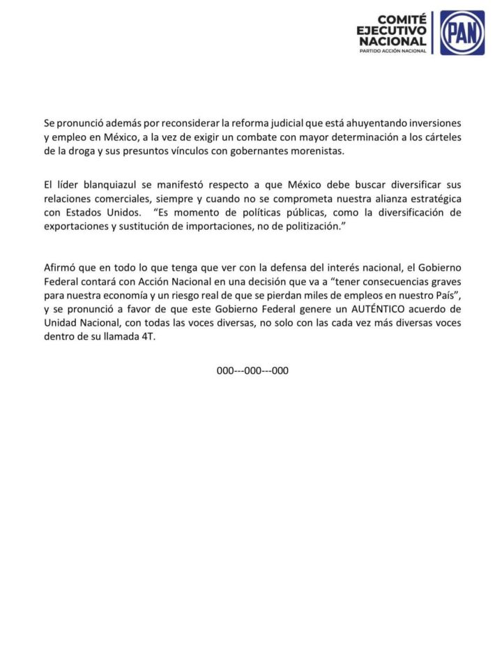 Afirmó que en todo lo que tenga que ver con la defensa del interés nacional, el Gobierno Federal contará con Acción Nacional en una decisión que va a “tener consecuencias graves para nuestra economía y un riesgo real de que se pierdan miles de empleos en nuestro País”, y se pronunció a favor de que este Gobierno Federal genere un AUTÉNTICO acuerdo de Unidad Nacional, con todas las voces diversas, no solo con las cada vez más diversas voces dentro de su llamada 4T.