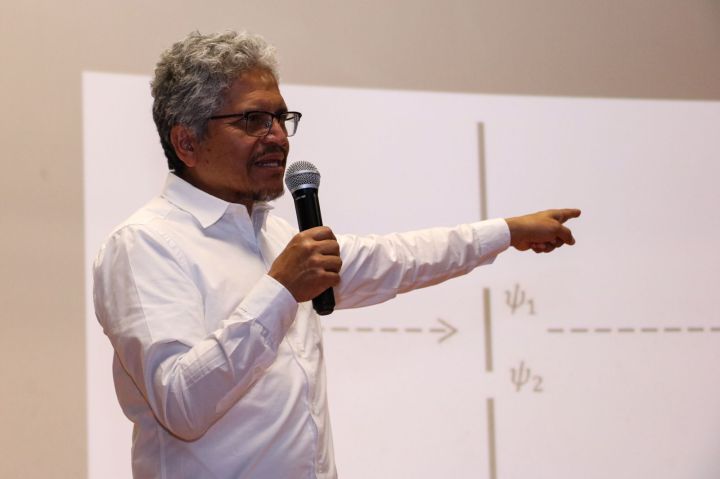 Posteriormente, se llevó a cabo la charla «Enredamiento Cuántico y las Simetrías de la Naturaleza», impartida por el doctor Víctor Manuel Velázquez Aguilar, director de la Facultad de Ciencias de la Universidad Nacional Autónoma de México (UNAM), conferencia tuvo como propósito acercar la ciencia al público desde una perspectiva de divulgación.