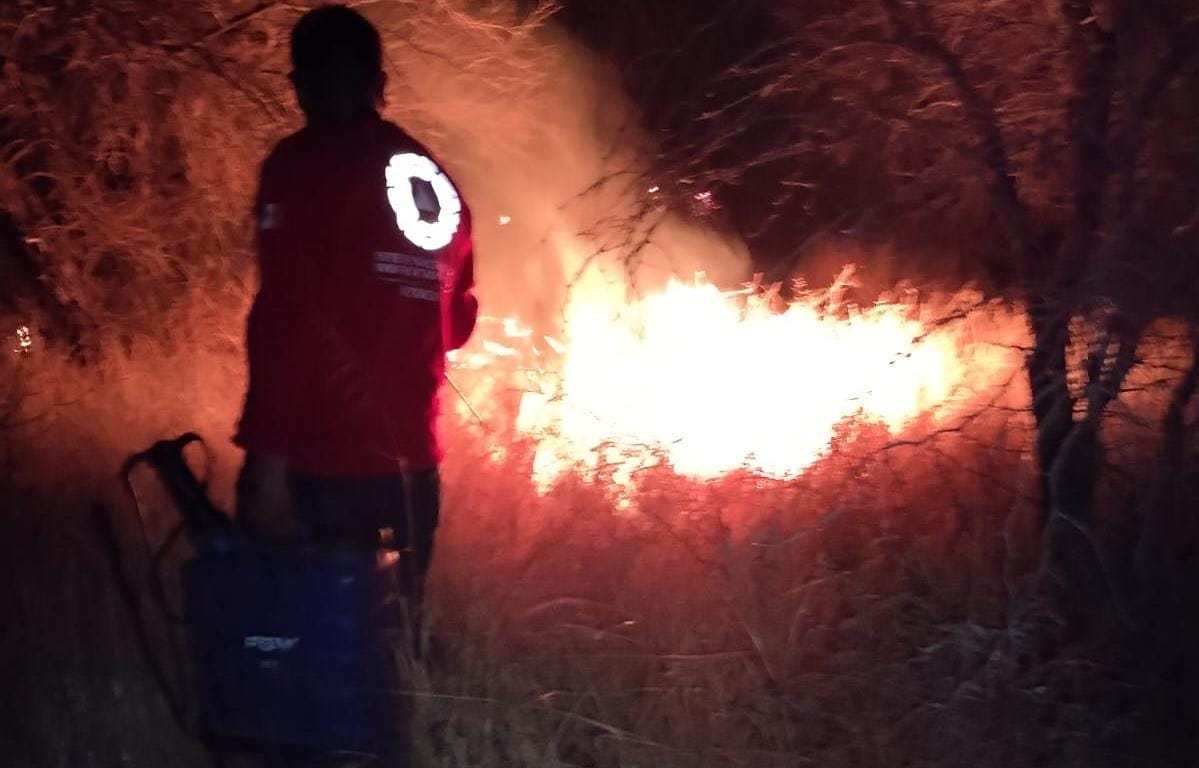 Esta noche, personal de Protección Civil Municipal de Soledad de Graciano Sánchez, trabaja en la extinción de un incendio en un predio baldío, en la localidad de Palma de la Cruz.