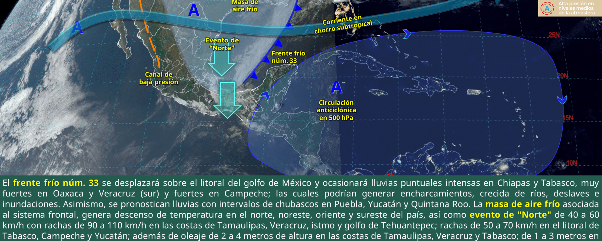 Evento de “Norte” de 40 a 60 km/h con rachas de 80 a 100 km/h: istmo y golfo de Tehuantepec; y de 20 a 30 km/h con rachas de 50 a 70 km/h, durante la mañana: Veracruz, Tabasco, Campeche, Yucatán y Quintana Roo.