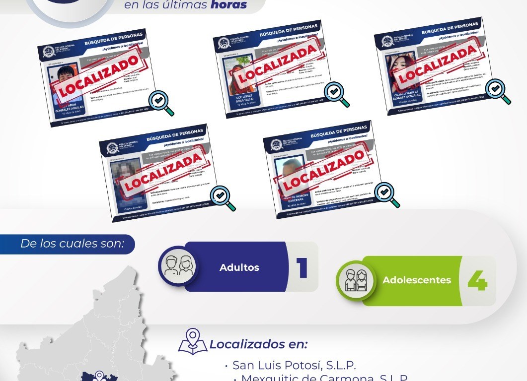 Durante el fin de semana, la Fiscalía General del Estado de San Luis Potosí (FGESLP) estableció el paradero de cinco personas que habían sido reportadas como no localizadas en diversos municipios de la entidad potosina.