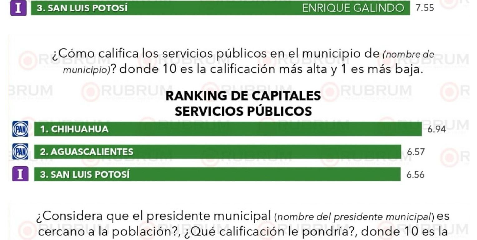 En la evaluación ciudadana hecha en 31 las ciudades capitales por la casa Rubrum, el Presidente Municipal de San Luis Potosí, Enrique Galindo Ceballos, se ubica entre los que alcanzan mayores calificaciones en las categorías de Trabajo y Desempeño; Calidad de los Servicios Públicos y Cercanía con la población.